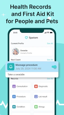 Spatom pretvara vaš pametni telefon u sveobuhvatni zdravstveni centar. Lako vodite evidenciju o svim medicinskim izveštajima, rezultatima dijagnostike, informacijama o vakcinaciji i alergijama, ne samo za ljude već i za vaše kućne ljubimce. Kreirajte digitalnu kućnu apoteku sa detaljnim podacima o lekovima, njihovoj dostupnosti i rokovima trajanja. Pratite ključne zdravstvene pokazatelje poput krvnog pritiska, telesne temperature, nivoa šećera u krvi, težine i ishrane, postavljajući sopstvene parametre praćenja. Pametni podsetnici obezbeđuju da nikada više ne propustite termin za terapiju ili lekarski pregled, dok mogućnost beleženja svih interakcija sa zdravstvenim ustanovama doprinosi potpunoj transparentnosti.