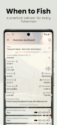 Pronađite najbolje vreme i mesto za slatkovodni ribolov uz "When to Fish"! Ovaj džepni savetnik pruža detaljne prognoze i uslove, koristeći informacije o vremenu i mesečevim menama. Prestanite da se oslanjate samo na sreću i povećajte svoj ulov.